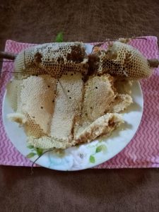 เมื่อห้องสมุดปิดต้องทำงานที่บ้านจึงมีโอกาสได้ไปคุยกับเพื่อนบ้านโดยเฉพาะเด็กๆที่ปิดเทอม ได้ถามเด็กๆว่าใครตัดผึ้งนำมาขายให้บ้างนะ คนที่นำมาให้เป็นหลานพึ่งเรียนจบ มาบอกว่าเพื่อนที่เป็นกระเป๋ารถบัสตกงานจึงหารังผึ้ง แต่ที่นำมาให้รังไม่ใหญ่มากหลานบอกว่าให้ฟรี จึงให้เงินไป 100 บาท บอกให้เอาไปซื้อขนมกินกัน ได้กินรังผึ้งทั้งตัวอ่อน และน้ำหวาน น้ำหวานจะหวานหอมนุ่มลมุลลิ้นมาก กินน้ำหวานไม่หมดเอาใส่แก้วไว้กินวันละ 1 ช้อนชา เพราะรังเล็กมีน้ำหวานไม่มาก รังผึ้งที่ได้มานั้นเดือน 5 ที่เรียกกันว่าน้ำผึ้งเดือน 5 ดีอย่างไรนั้น ก็คือน้ำผึ้งเดือน 5 ดีที่สุด เพราะเป็นน้ำผึ้งที่มีความเข้มข้นสูง เนื่องจากเดือน 5 เป็นเดือนที่มีอากาศร้อนทำให้มีความชื้นต่ำ น้ำผึ้งที่ผึ้งผลิตได้จึงมีความชื้นต่ำไปด้วย เป็นช่วงที่ใบไม้ดอกไม้กำลังผลิดอกออกใบทำให้ผึ้งสามารเก็บน้ำหวานและเกสรดอกไม้ได้หลากหลายพันธุ์ น้ำผึ้งที่ได้จึงเป็นเหมือนยาสมุนไพร ด้วยเหตุนี้จึงไม่น่าแปลกใจที่ น้ำผึ้งเดือน 5 ขึ้นชื่อว่าเป็นน้ำผึ้งที่ดีกว่าน้ำผึ้งในเดือนอื่น เพราะมันเข้มข้นและเปี่ยมไปด้วยคุณภาพ น้ำผึ้งมีคุณประโยชน์มากมาย อย่างเช่นวิตามิน เกลือแร่ สำหรับใครที่ชอบซื้อน้ำผึ้งมาตุนไว้ในบ้านก็ต้องระวังเรื่องการเก็บรักษา เพราะโดยทั่วไปน้ำผึ้งจะเก็บได้ประมาณ 1 ปีครึ่ง หากเก็บไว้นานกว่านี้ สี กลิ่น รส จะเปลี่ยนไปจากสีเหลืองกลายเป็นสีอื่น และไม่นิยมเก็บไว้ในตู้เย็น