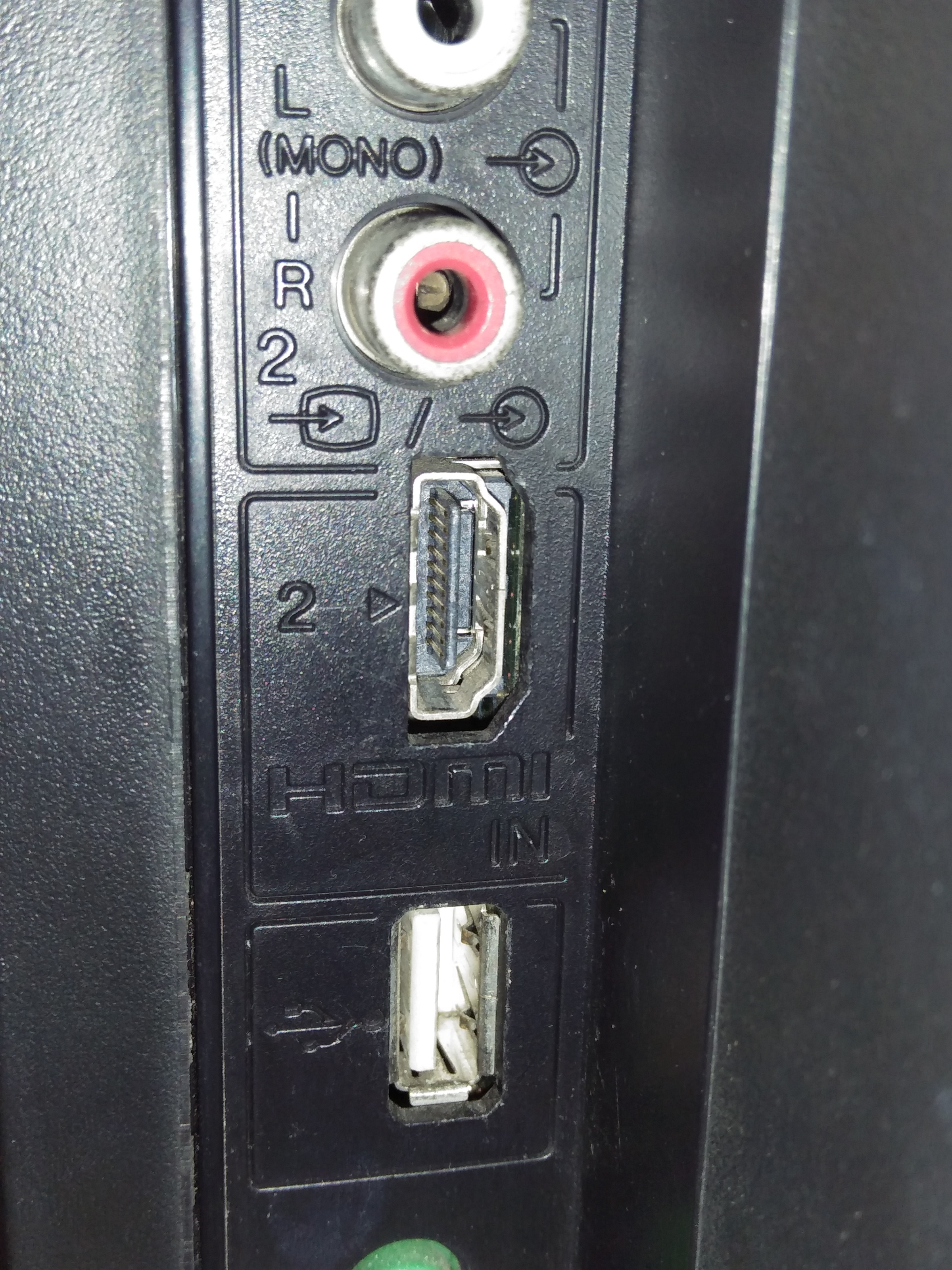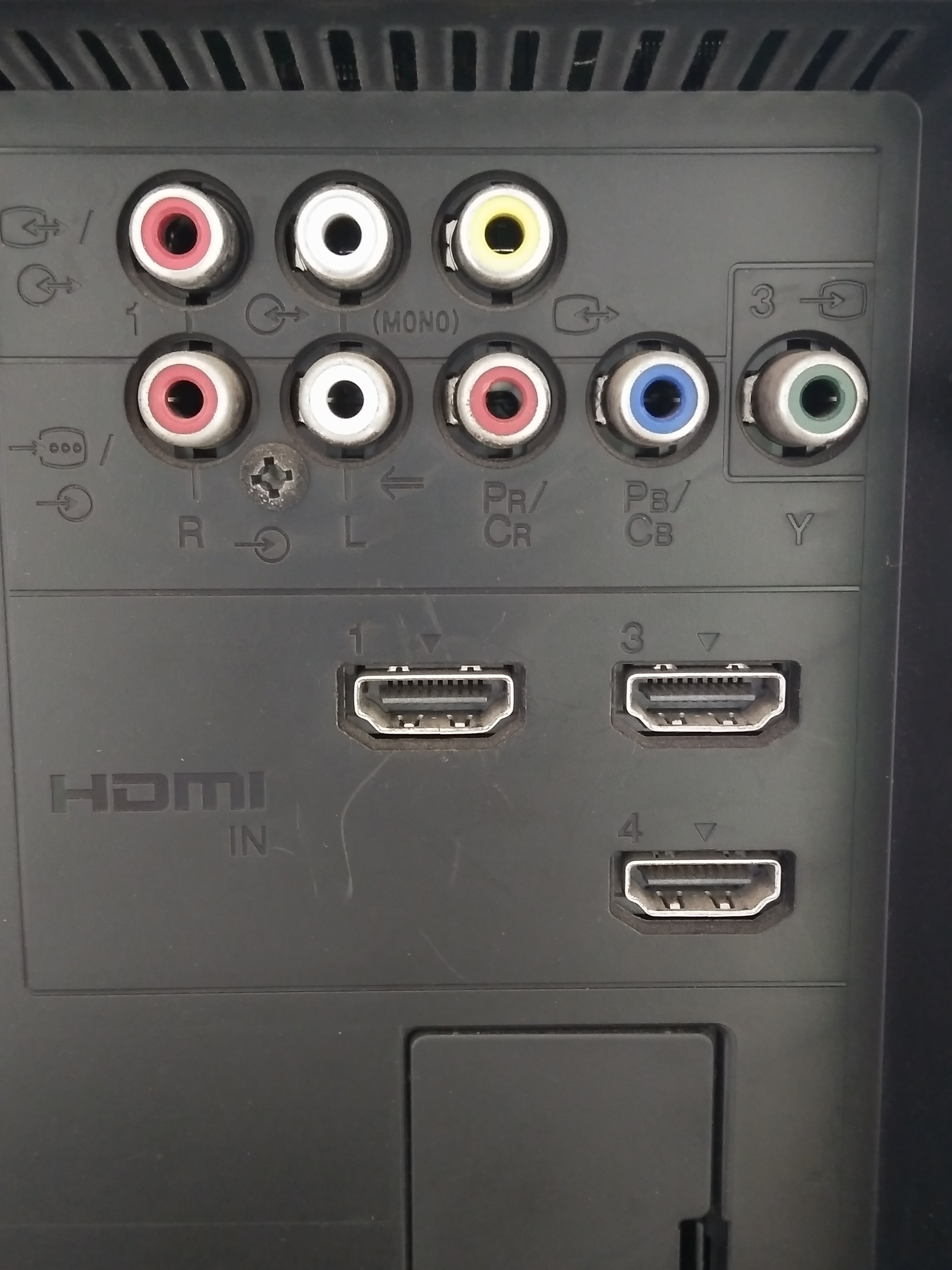 ด้านหลังทีวีจะมีช่องต่อ HDMI มีช่องต่อ VGA และช่องแจ็คต่อ 3.5 มม. สีเหลือง สีขาว สีแดง