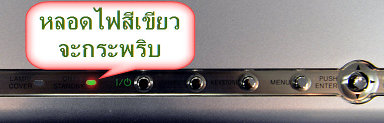หลอดไฟสีเขียวที่เครื่องฉายโปรเจคเตอร์จะกระพริบซึ่งในขั้นตอนนี้ให้รอหลอดไฟสีเขียวหยุดกระพริบและหลอดจะติดสว่างโดยเปลี่ยนจากสีเขียวเป็นสีแดงติดสว่างแทน ดังแสดงในภาพ ๕