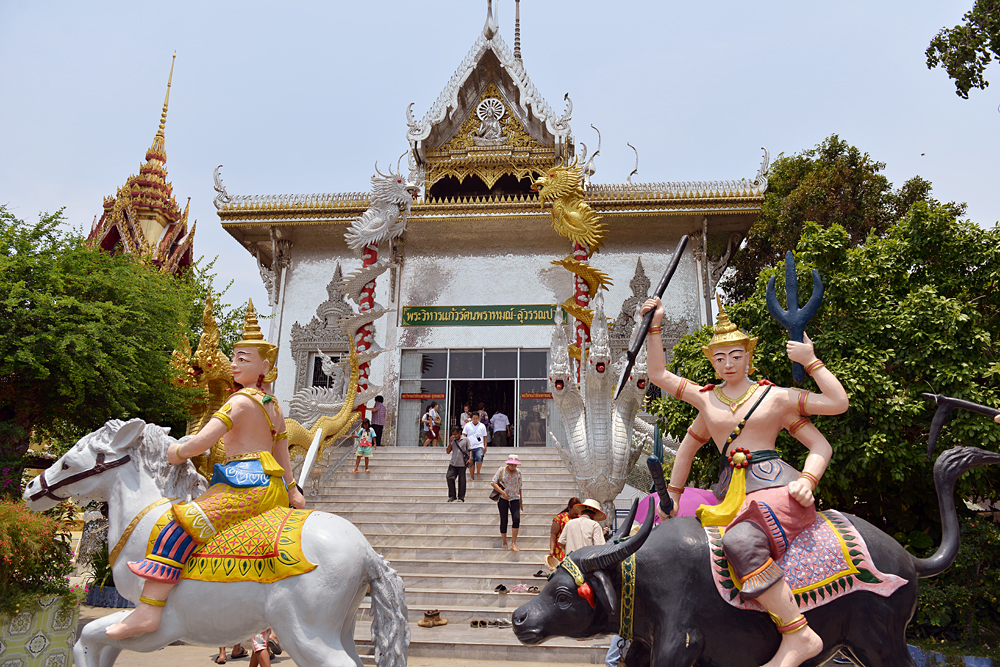 นอกจากองค์พระใหญ่แล้ว ในบริเวณวัดยังมีสิ่งอื่นๆ ที่มีความน่าสนใจไม่ยิ่งหย่อนไปกว่ากัน เช่น วิหารด้านข้างที่ประดิษฐานองค์พระโพธิสัตว์กวนอิมปางพันกร ที่มีความยิ่งใหญ่และสง่างามเป็นอย่างยิ่ง ถัดไปที่บริเวณใกล้เคียงกันจะเป็นที่ตั้งของ “วิหารแก้ว” ซึ่งเป็นวิหารที่ใช้กระจกชิ้นเล็กๆ ประดับตกแต่งทั่วทั้งหลัง ทำให้วิหารแห่งนี้มีความวิจิตรงดงามตระการตายิ่งนัก ซึ่งภายในวิหารยังมีพระพุทธรูปเนื้อเงินแท้ประดิษฐานเป็นพระประธาน ด้านข้างรายรอบด้วยรูปหล่อทองเหลืองของพระเกจิอาจารย์ชื่อดัง ออกจากวิหารแก้วแล้วบริเวณสวนภายในวัดมีรูปปูนปั้นต่างๆ จัดแสดงไว้มากมาย ทั้งเรื่องราวของแดนนรก ที่จะบอกให้เราได้รู้ว่าถ้าทำบาปอะไรแล้วจะต้องได้รับกรรมอะไรบ้าง ซึ่งในส่วนนี้จะเป็นการแฝงคติธรรมคำสอนเรื่องบาป บุญ คุณ โทษ ตามความเชื่อทางพุทธศาสนา ให้เราได้ละอายต่อการทำบาป นอกจากนี้ยังมีรูปปูนปั้นของเหตุการณ์ในประวัติศาสตร์ไทย รวมไปถึงรูปปูนปั้นของตัวละครในวรรณคดี และอื่นๆ อีกมากมาย ส่วนสุดท้ายที่ห้ามพลาดนั่นก็คือ “อุโบสถ” ของวัดม่วงที่ถูกล้อมรอบไว้ด้วยกลีบดอกบัวขนาดยักษ์ ซึ่งจัดว่าเป็นอุโบสถที่ตั้งอยู่กลางดอกบัวที่ใหญ่ที่สุดในโลก บริเวณภายในดอกบัวรอบๆ อุโบสถประดิษฐานรูปปั้นเหมือนของพระเกจิอาจารย์ชื่อดังจากทั่วประเทศ