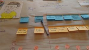 หลังจากฟังการอธิบายหลักการแล้ว วิทยากรกำหนดให้ผู้เข้าอบรมแบ่งกลุ่มเป็น 8 กลุ่ม แต่ละกลุ่มจะได้ ‘ผู้ใช้บริการจำลอง’ (persona) กลุ่มละ 1 คน กลุ่มข้าพเจ้าได้ ‘โนบิตะ’ เป็นผู้ใช้บริการจำลอง สมาชิกในกลุ่มจะต้องทำการศึกษาเบื้องต้นเกี่ยวกับ persona ของตัวเอง โดยศึกษาถึง ภูมิหลัง ชีวิตทั่วไป ความอึดอัดใจหรือปัญหาในขบวนการต่าง ๆ เพื่อเข้าถึงบริการ เมื่อทราบข้อมูลแล้ว จะนำมาสร้างสรรค์ และประยุกต์ใช้จริง Understanding > Creation > Implementation