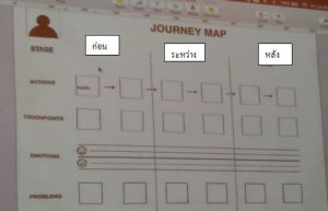 นำข้อมูลทั้งหมดมาทำ Journey map เพื่อทำผังประสบการณ์ของ persona โดยแบ่งเป็น ก่อนการเกิดเหตุการณ์ (Before) ระหว่างการเกิดเหตุการณ์ (During) และหลังจากเกิดเหตุการณ์ (After) เพื่อทำการศึกษาและวิเคราะห์ persona